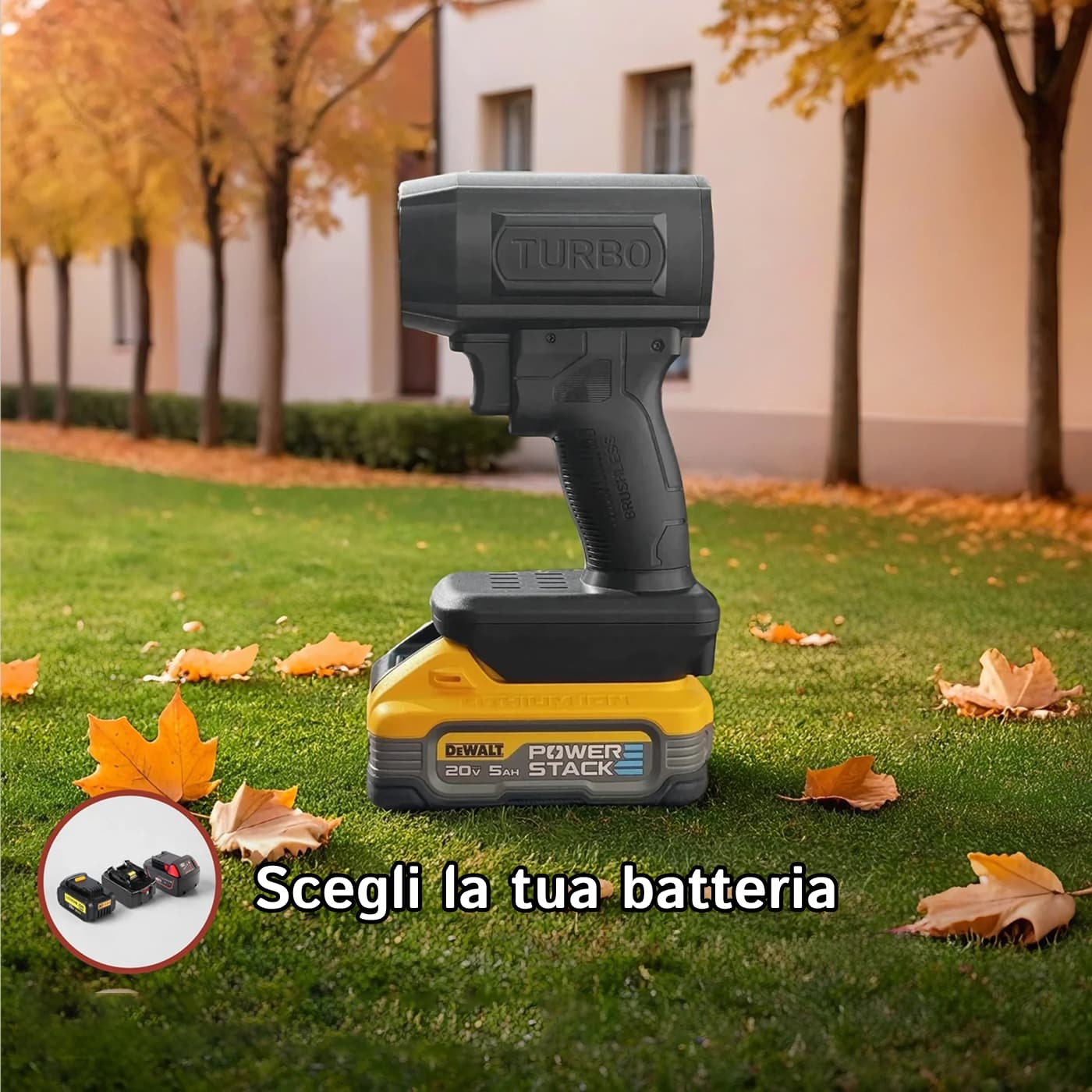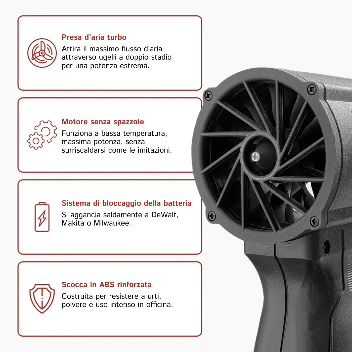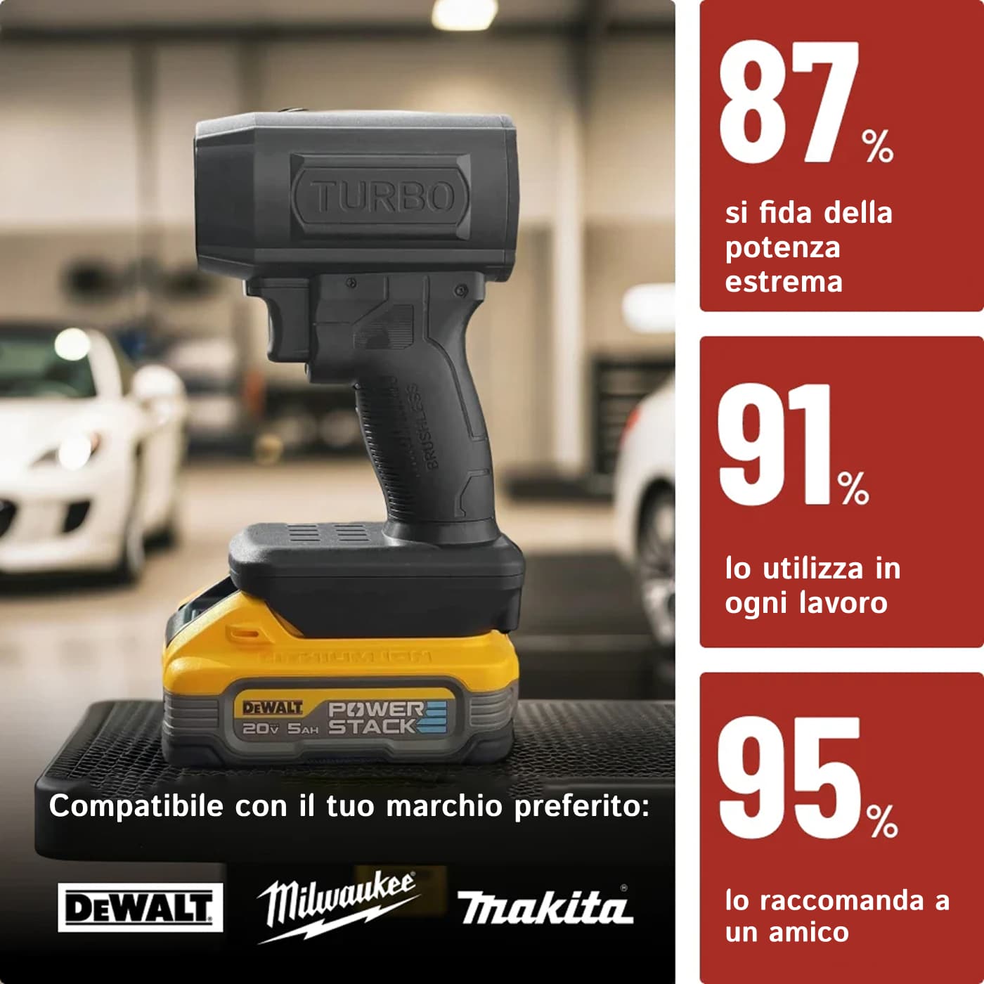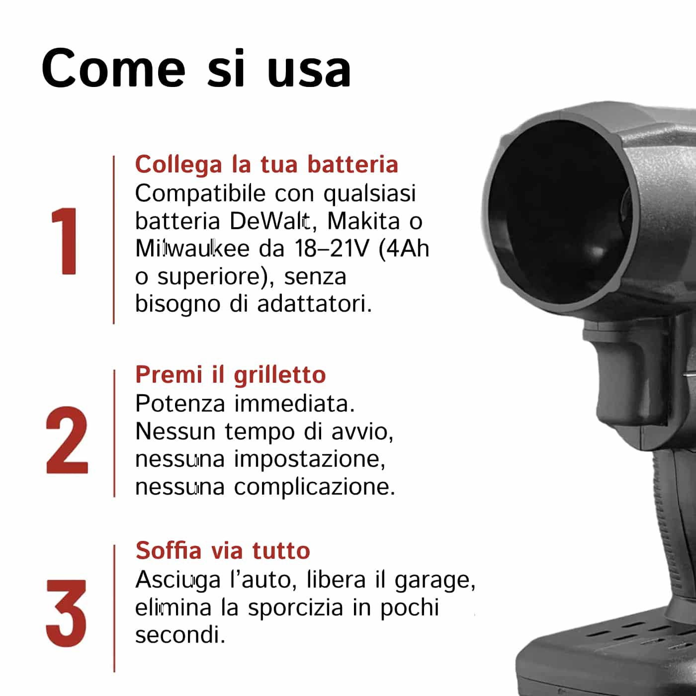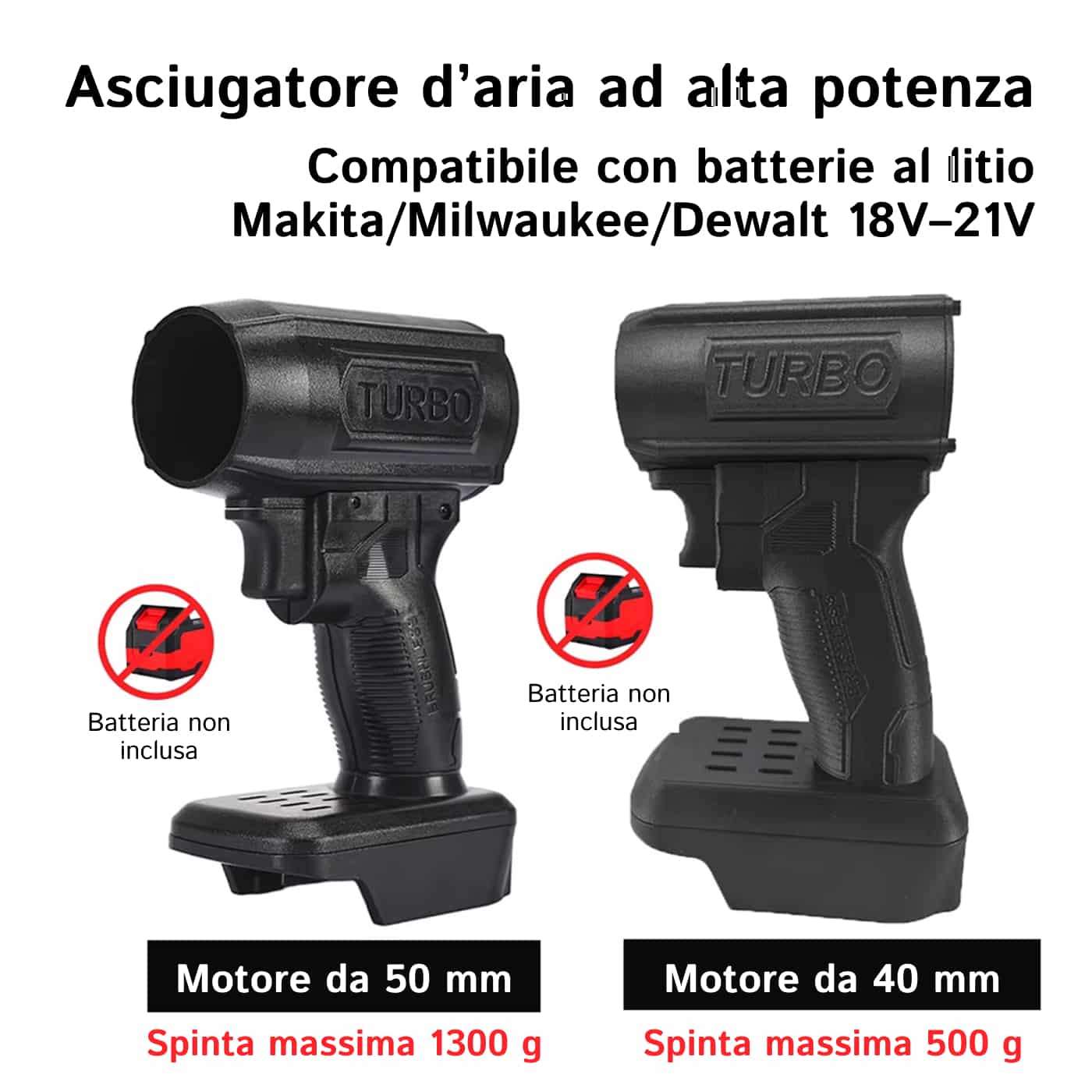 Sì, AeroxDry è compatibile con batterie Makita, Milwaukee e Dewalt da 18V-21V, quindi puoi utilizzare le batterie che già possiedi senza acquisti aggiuntivi per massima convenienza.