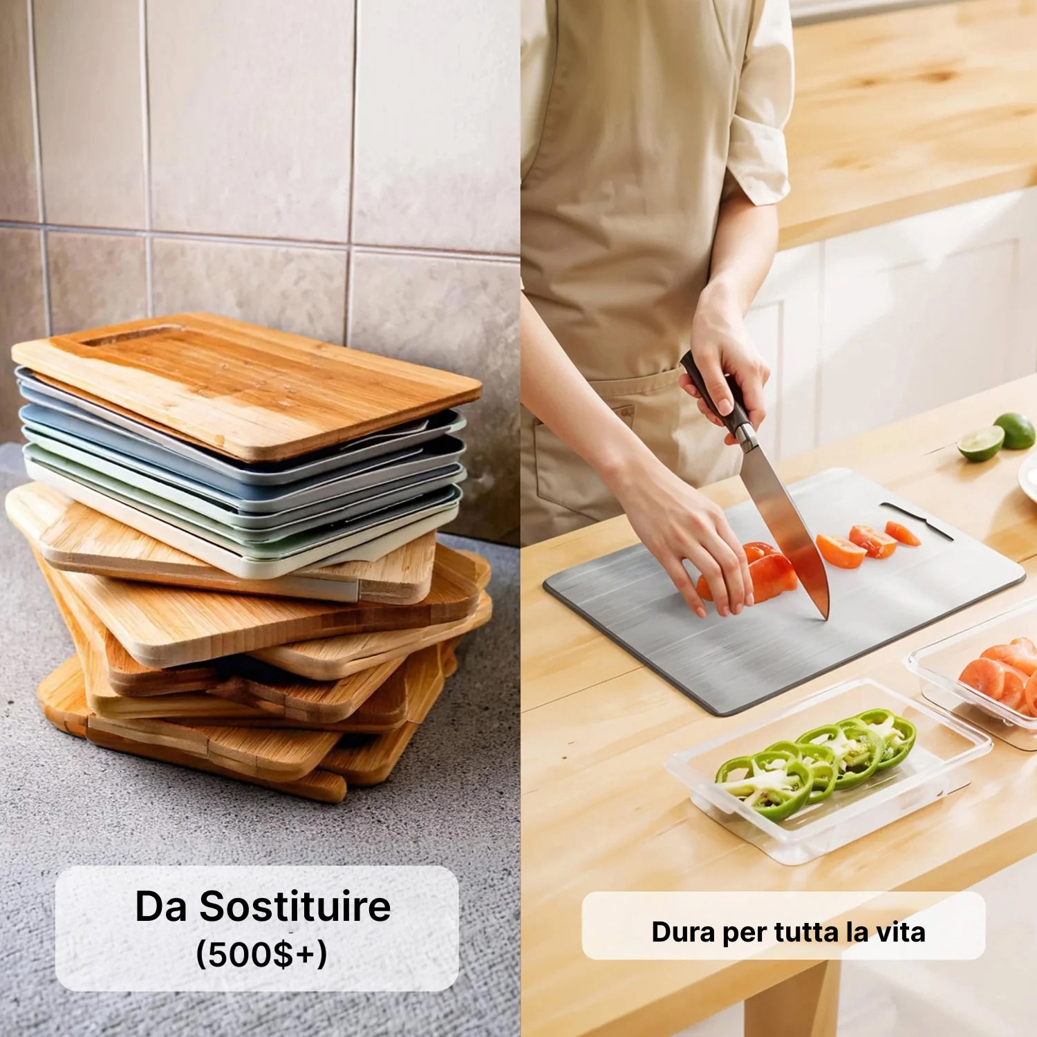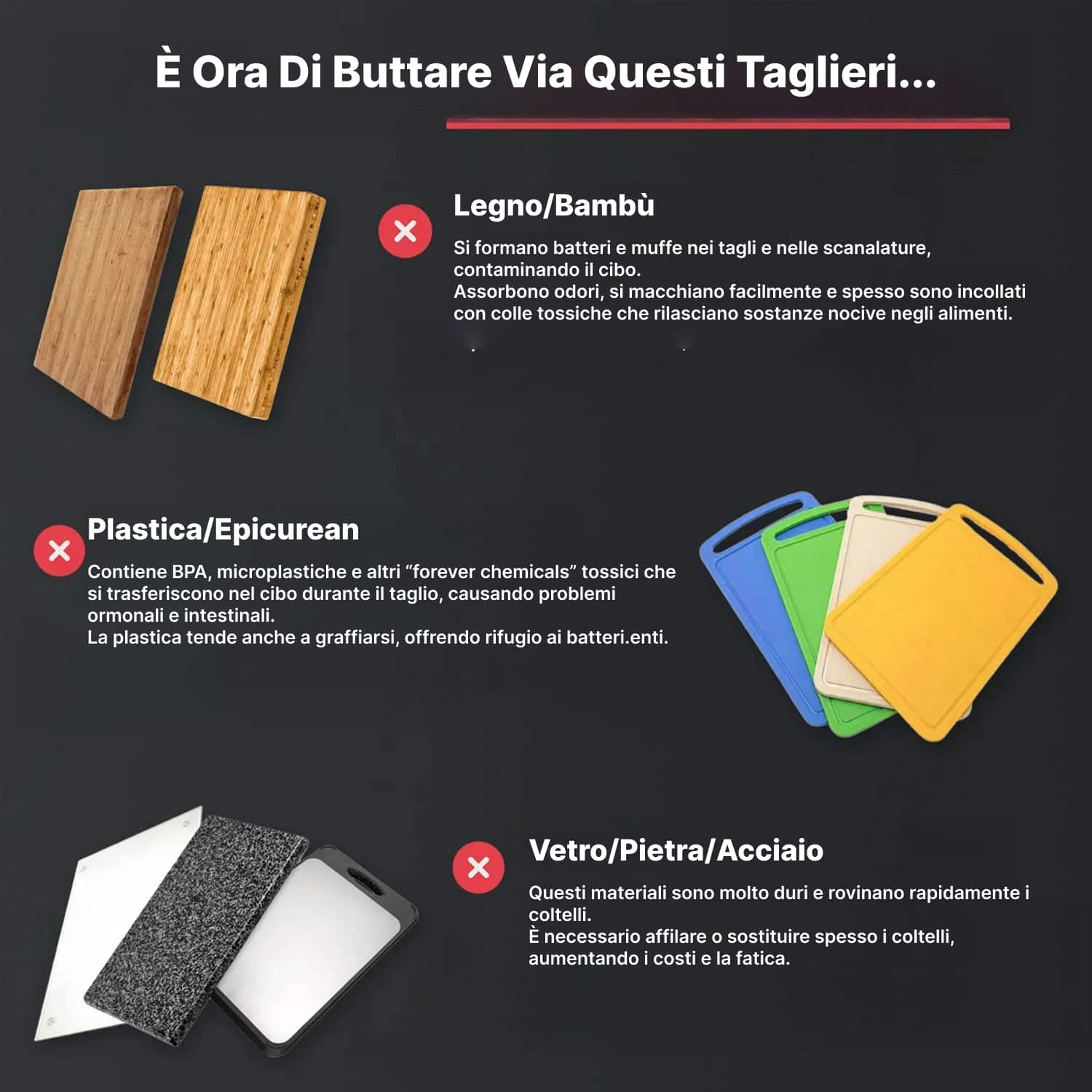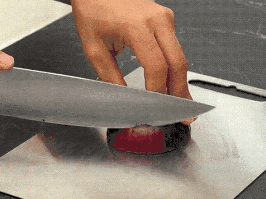 No, al contrario. Il titanio del Besforcut è tre volte più morbido dell'acciaio, proteggendo le lame e prolungandone l'affilatura rispetto ai taglieri tradizionali in plastica o vetro.