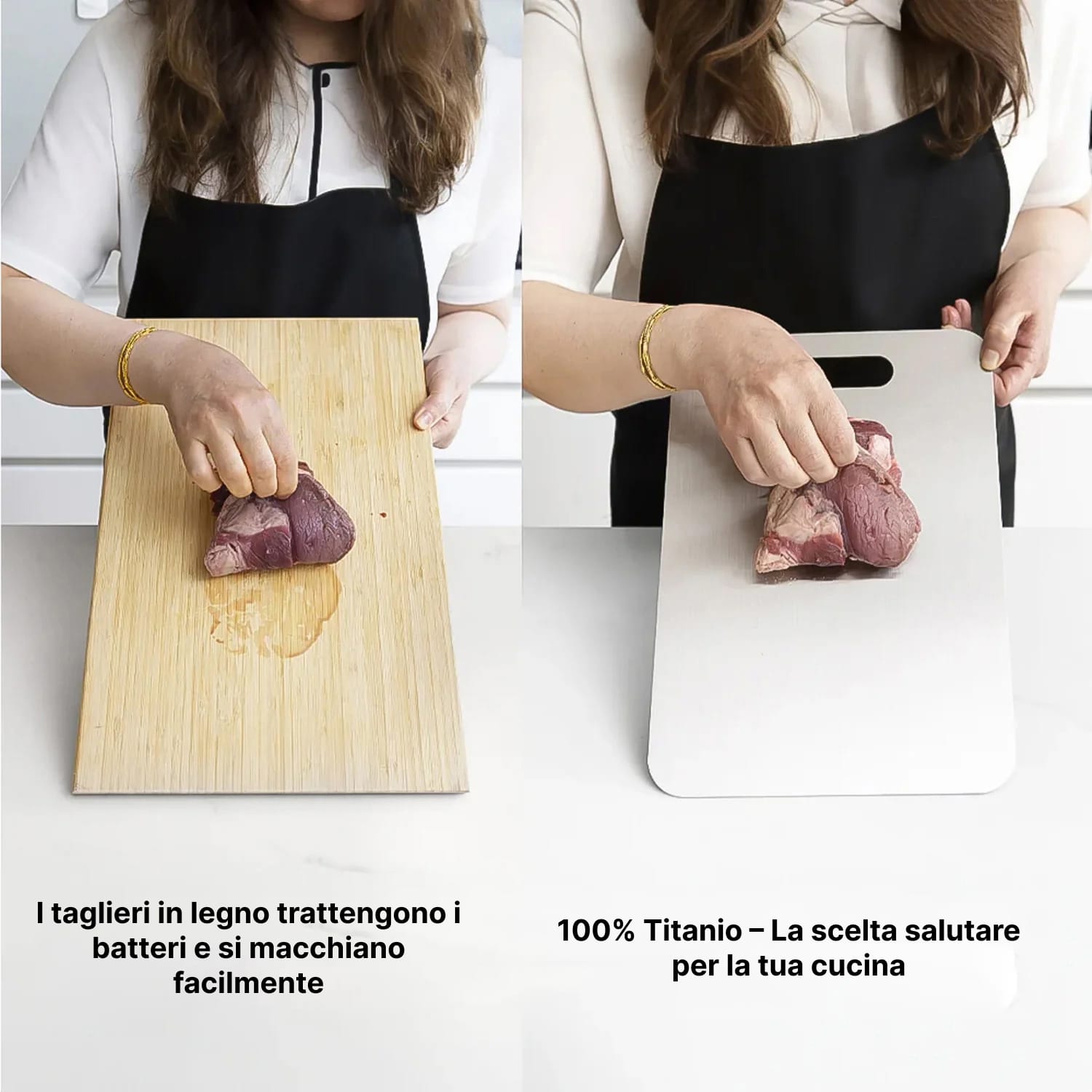 Certamente. La superficie antibatterica in titanio è ideale per carne cruda, prevenendo la contaminazione incrociata e garantendo una pulizia completa dopo ogni utilizzo per massima sicurezza.