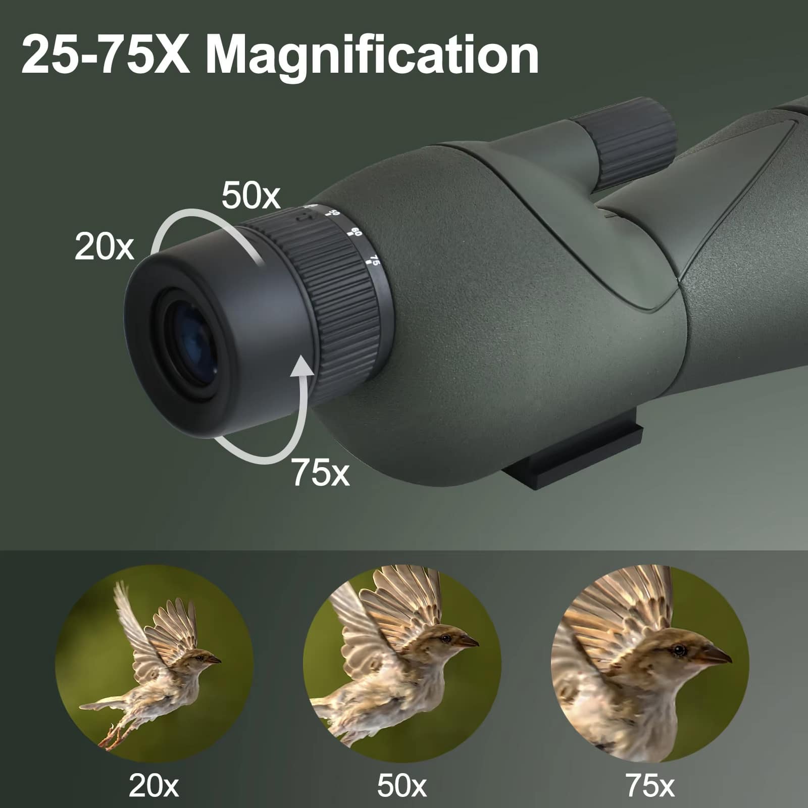 The EyeZomix offers 25x-75x variable zoom, perfect for both scanning large areas and detailed close-up bird observation.