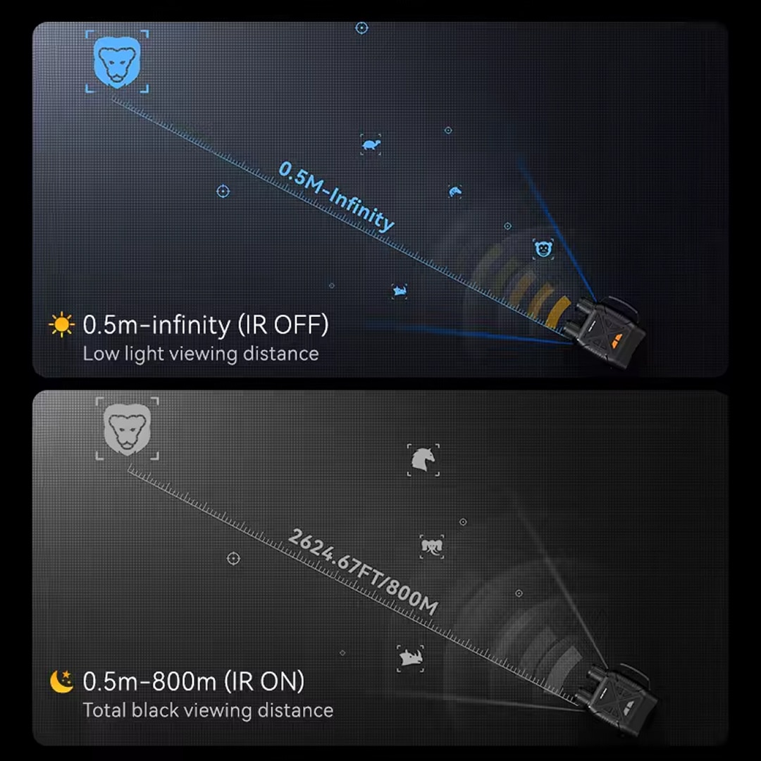 Hutedark Infrared Binoculars provide clear visibility up to several hundred yards in total darkness, depending on infrared illumination strength and environmental conditions, making them perfect for most nighttime activities.