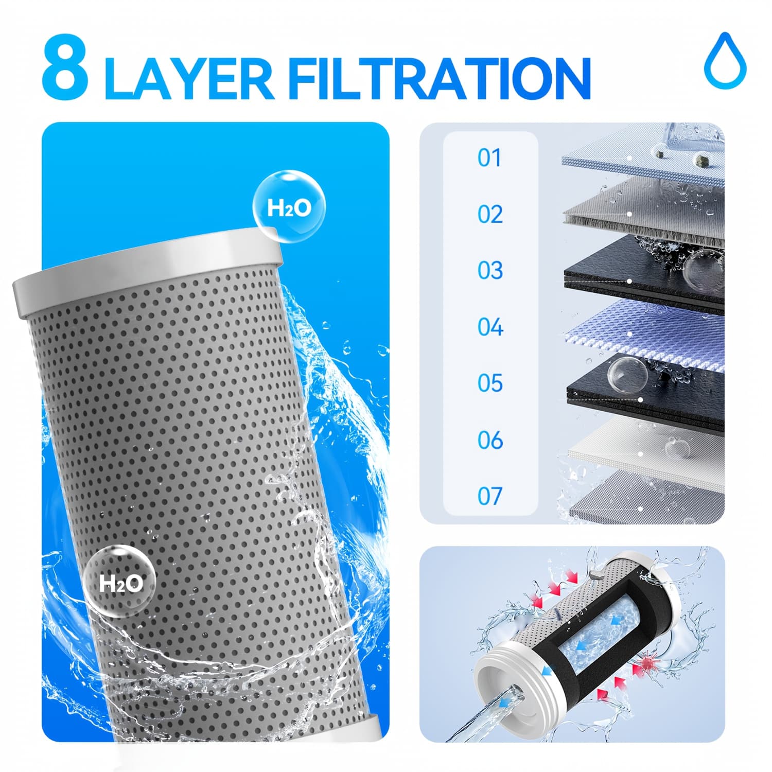The 8-stage system removes 99.8% of E. coli, 99.5% of Staphylococcus aureus, 94.8% of chlorine, and inhibits 98.7% of scale. It also filters sediment, improves taste, prevents limescale buildup, and provides UV bacteriostatic protection.