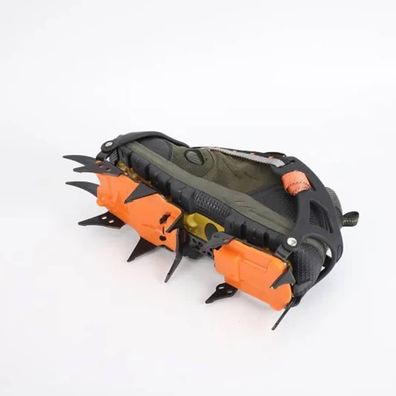 IceCragi Crampons feature twelve 1.5-inch manganese steel spikes that penetrate deep into ice, packed snow, and frozen terrain. Each spike is strategically positioned to provide maximum surface contact, ensuring stable footing whether you’re ascending steep slopes or traversing glacial paths.