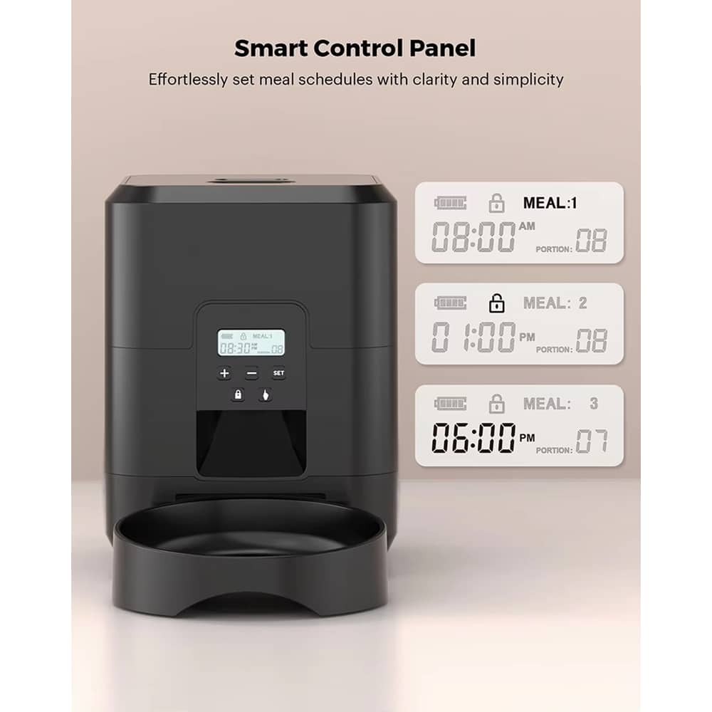 You can program up to four separate meals daily with customizable portion sizes ranging from small snacks to full meals.