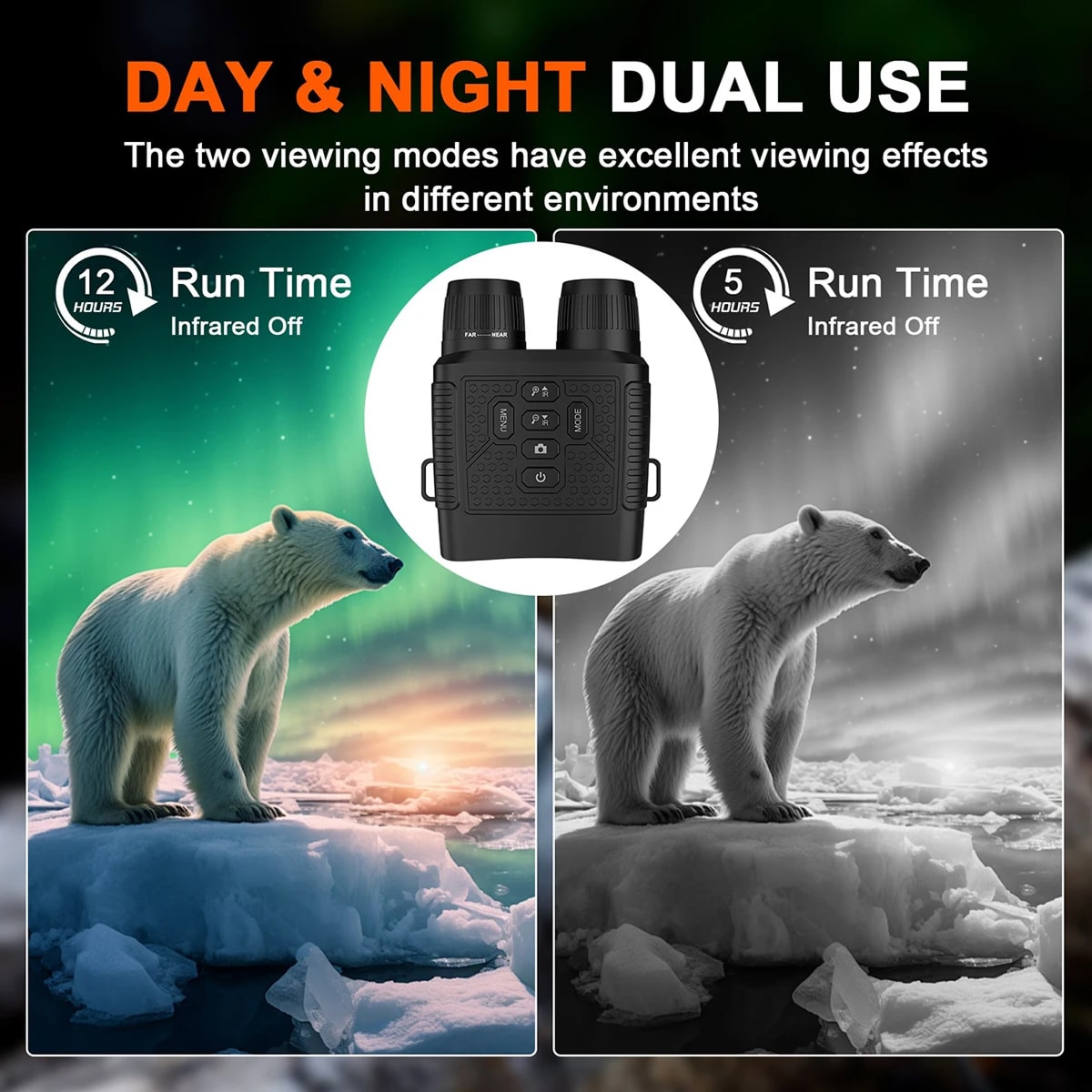 Yes, these binoculars feature a dual-mode system that provides full-color viewing during the day and infrared-enhanced viewing at night.
