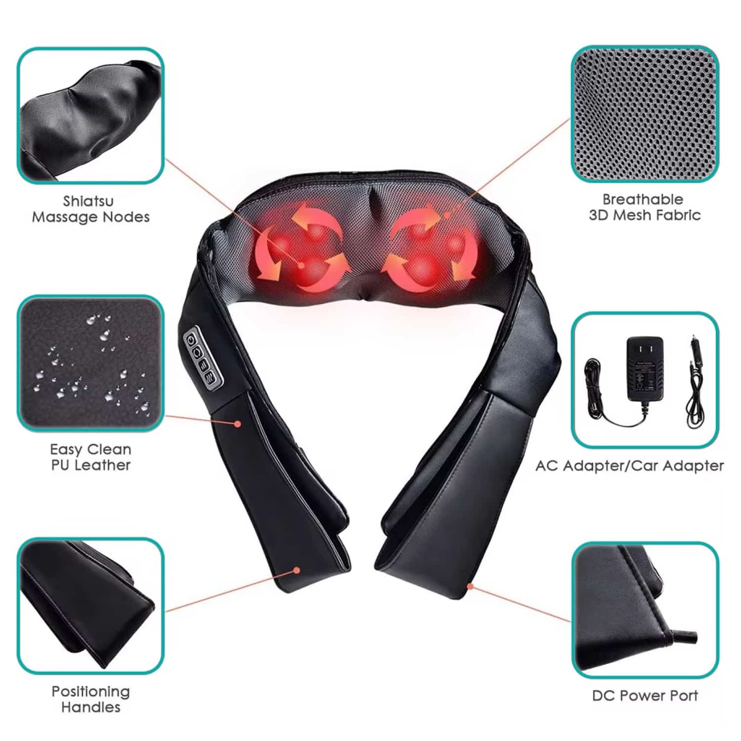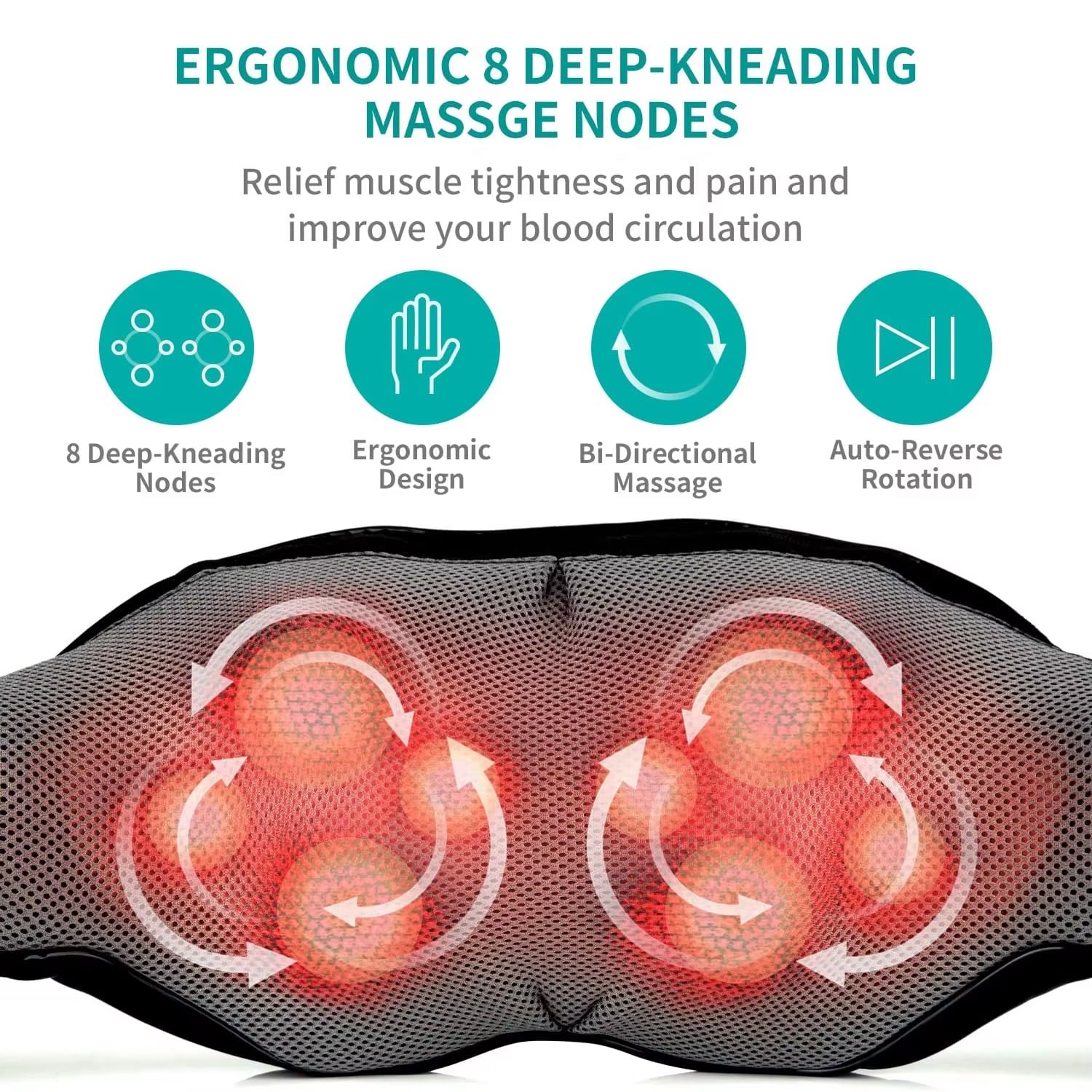 The dual-direction nodes rotate clockwise and counterclockwise, mimicking professional massage techniques. This bi-directional motion effectively targets deep tissue tension and knots for comprehensive relief throughout your neck and shoulders.