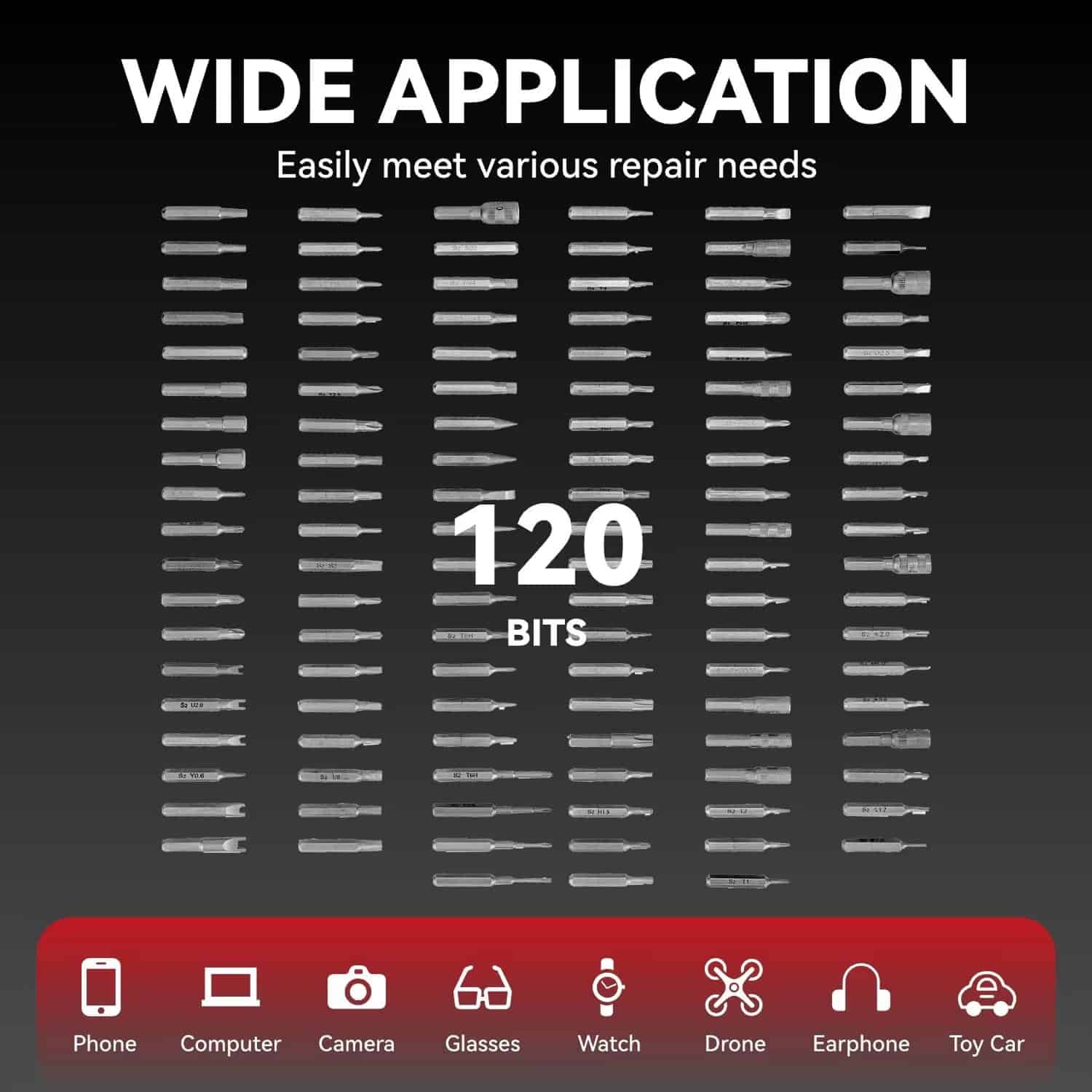 The Screwokit works with smartphones, laptops, tablets, gaming consoles, cameras, watches, eyeglasses, furniture, appliances, and virtually any device requiring precision screwdriving. Its comprehensive bit selection covers all common repair scenarios.