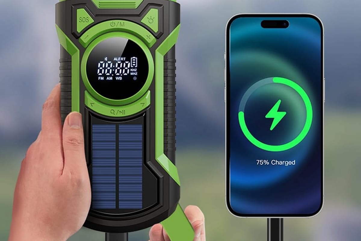 Solar charging works in cloudy conditions but at reduced efficiency; hand crank and USB charging provide reliable alternatives.