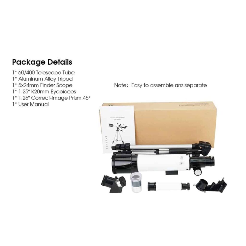 Moon craters, Jupiter’s bands and moons, Saturn’s rings, nebulae, star clusters, and galaxies under good conditions. The 400mm focal length delivers excellent planetary detail.