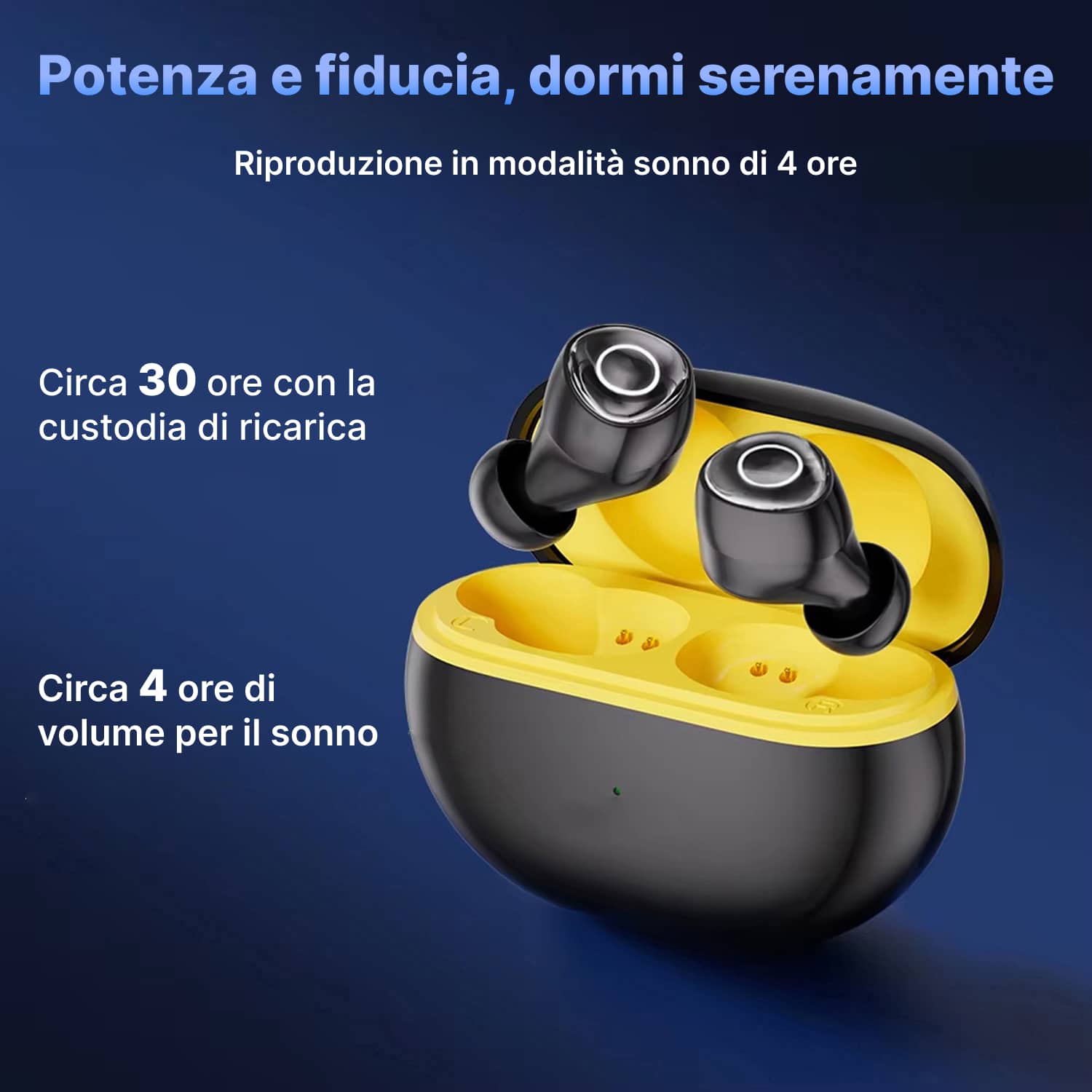 In modalità sonno ottieni 10 ore continue di riproduzione a volume ottimale per dormire. Con la custodia di ricarica raggiungi fino a 30 ore totali, perfetto per diversi giorni senza ricarica.