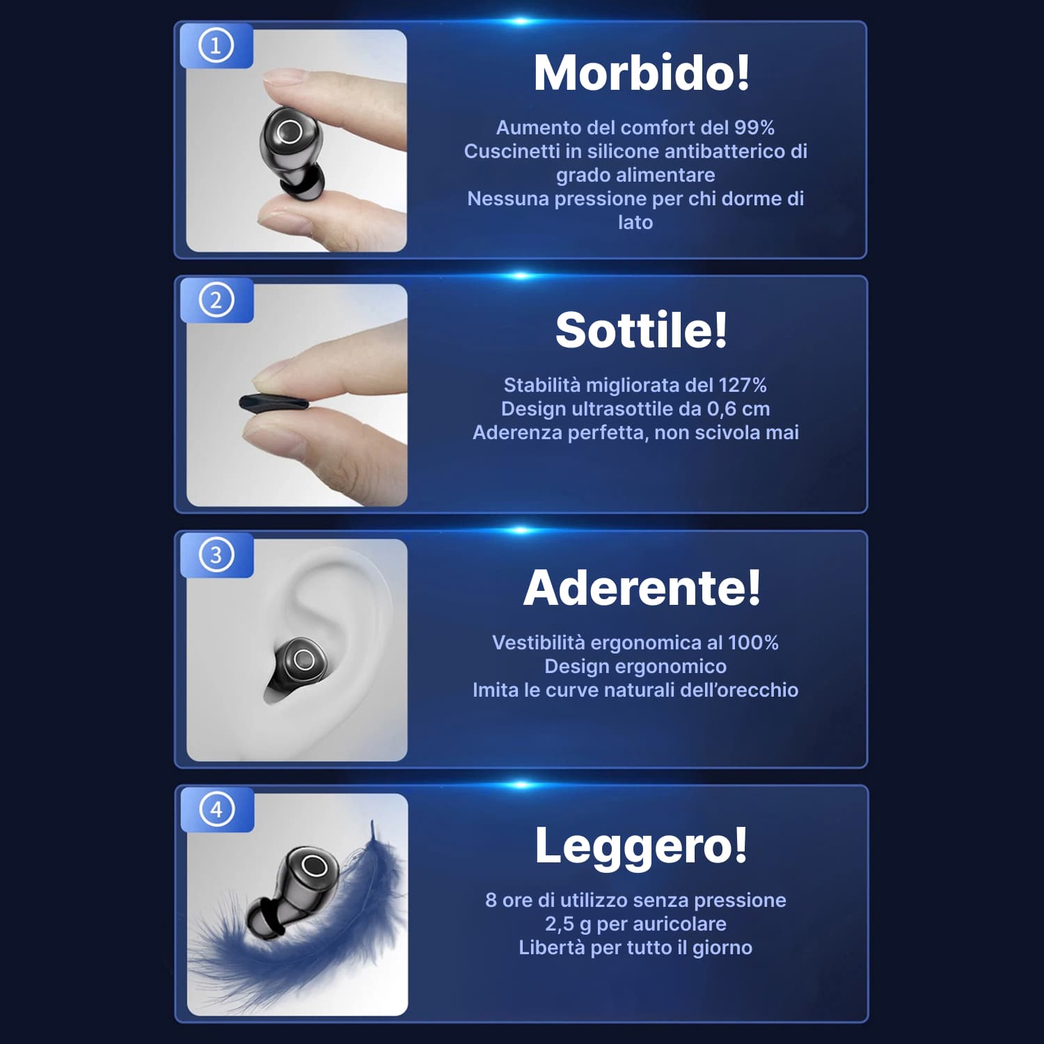 Assolutamente sì. Il design ultra-sottile da 0,6cm e il peso di 2,5g per auricolare eliminano ogni pressione. I materiali morbidi ibridi garantiscono comfort totale anche per chi dorme prevalentemente su un lato.