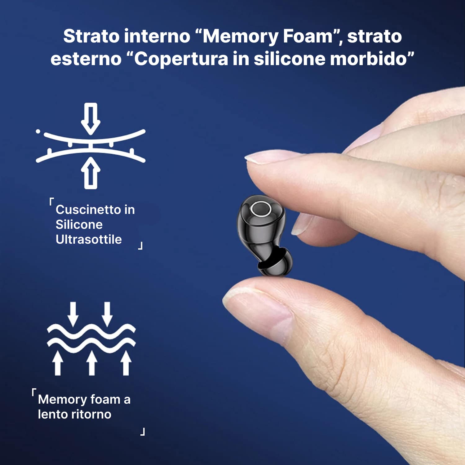 Inclusi tre gommini di taglie diverse (S/M/L) con design ovale che segue la forma naturale dell'orecchio. Silicone alimentare ipoallergenico e antibatterico ideale per pelli sensibili e canali auricolari piccoli.