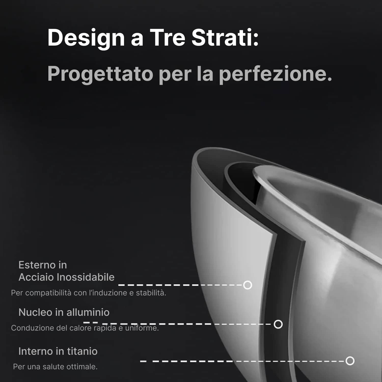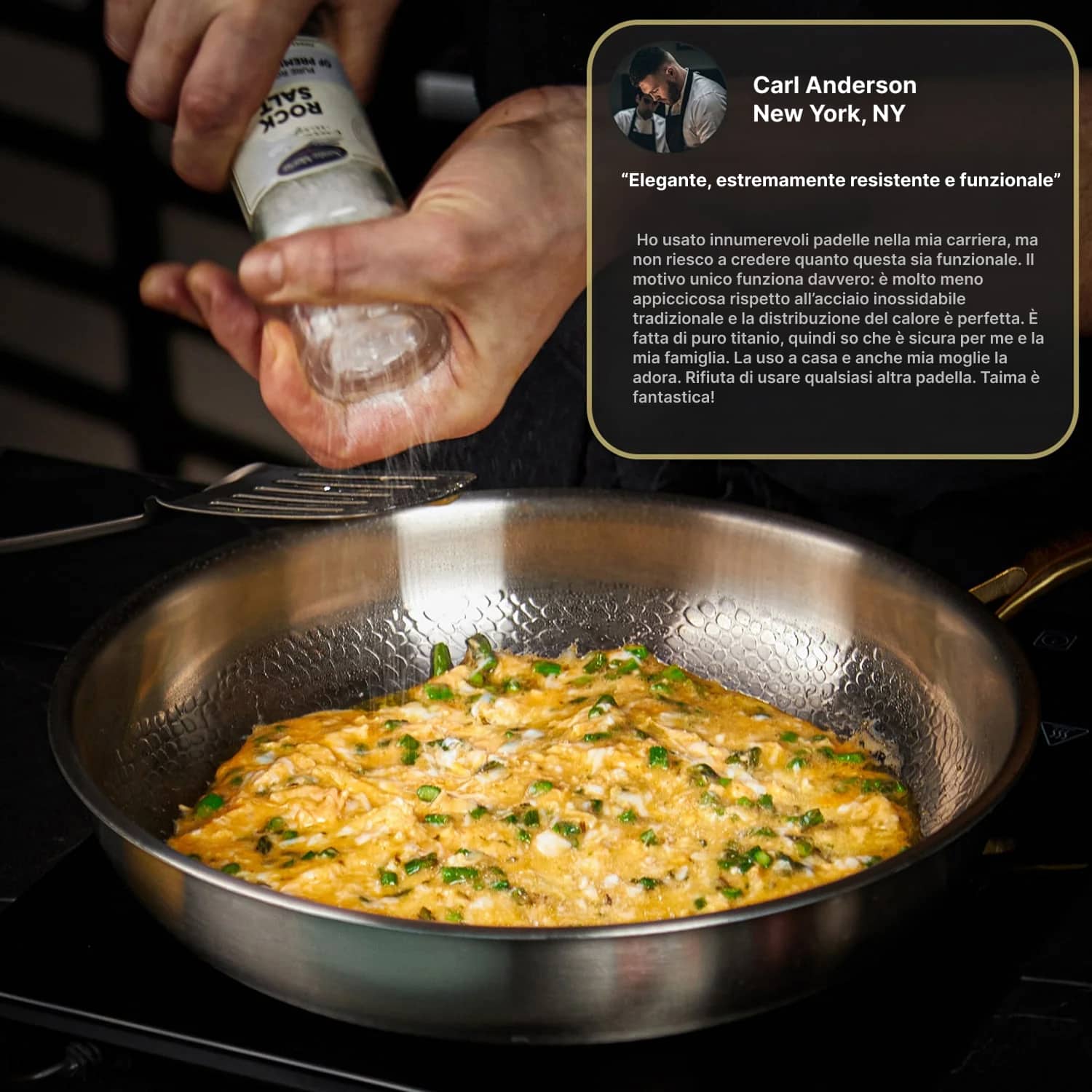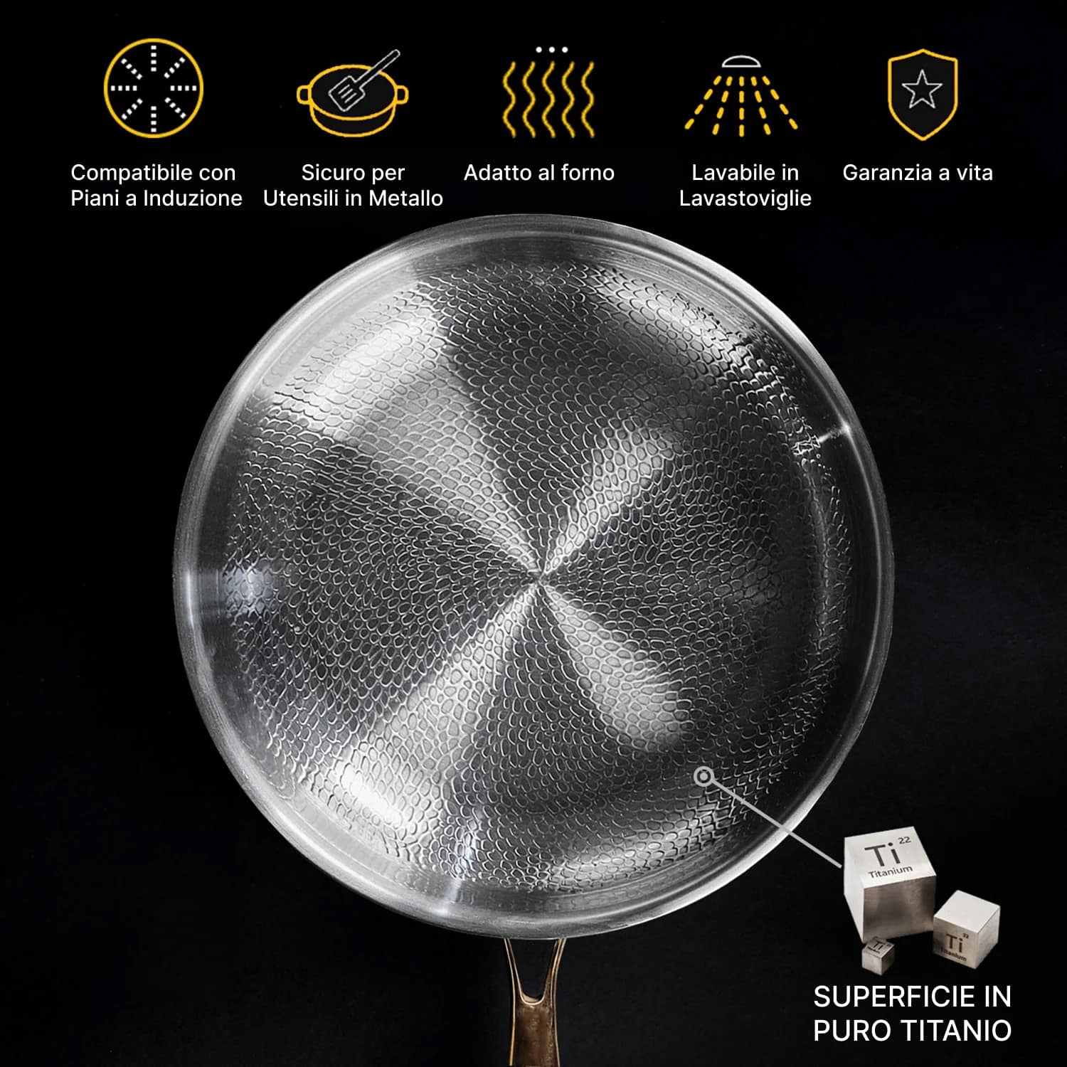 Sì, la superficie in titanio puro è estremamente resistente ai graffi. Puoi usare utensili in metallo senza danneggiare la padella, anche se consigliamo utensili in legno o silicone per una durata ancora maggiore.