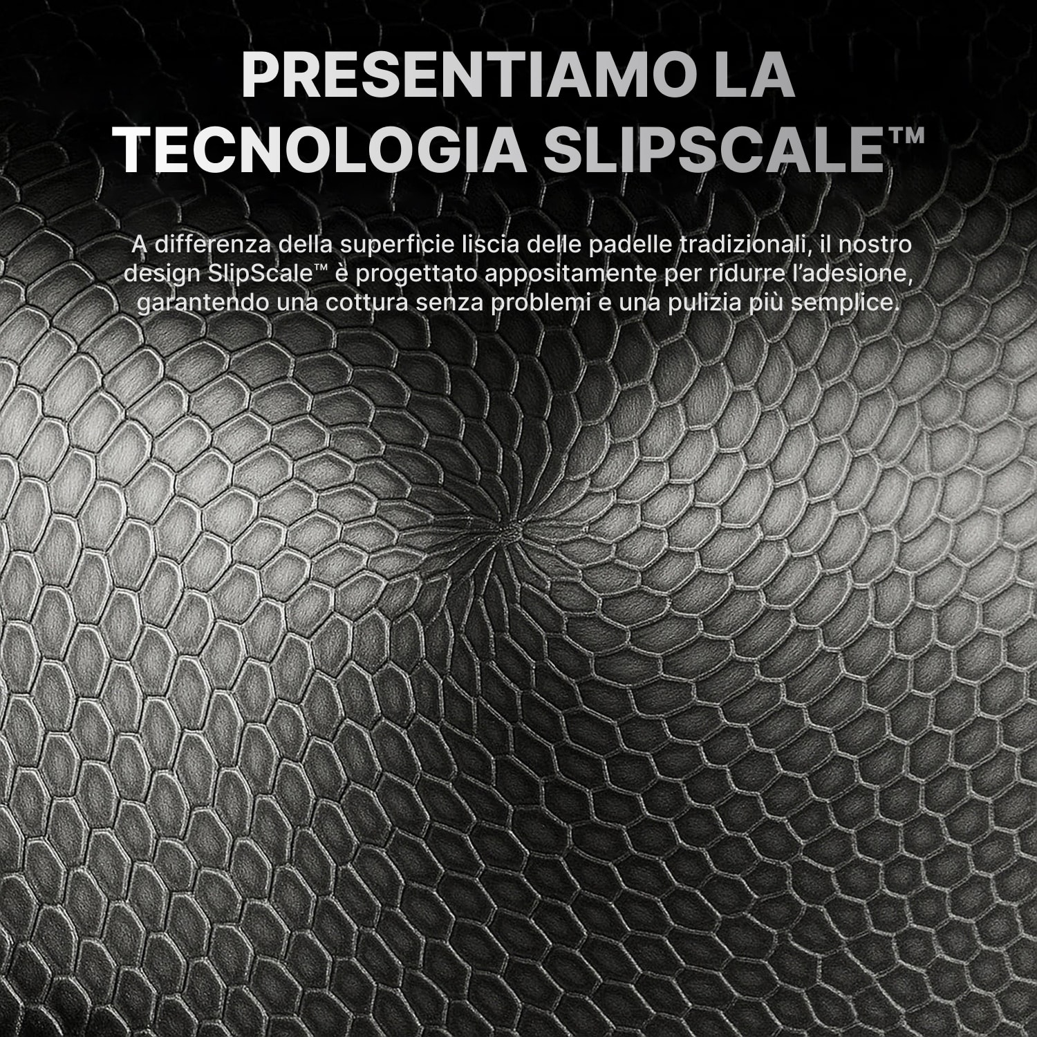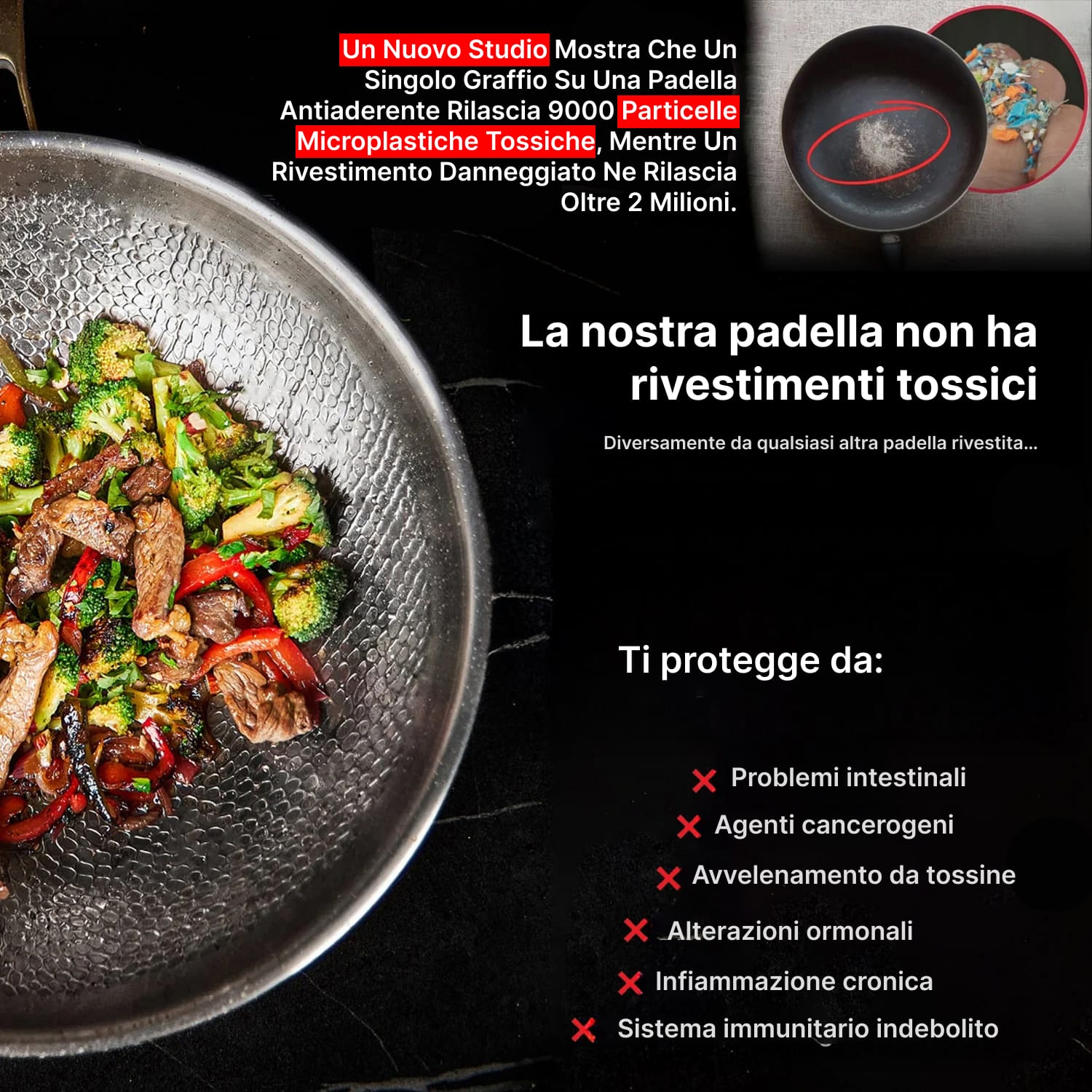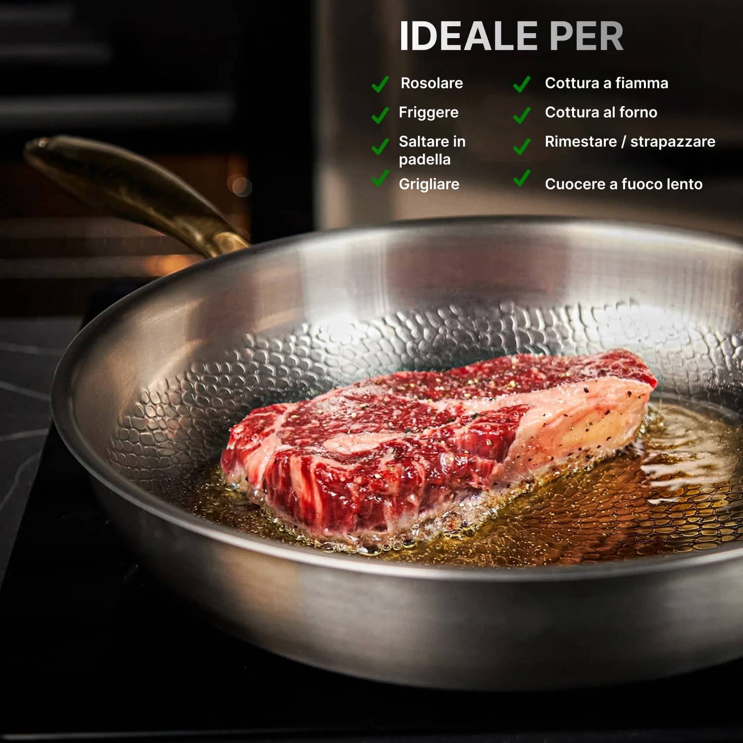 Con il preriscaldamento adeguato e una piccola quantità di olio, il cibo non si attacca. La superficie liscia in titanio e il trasferimento di calore uniforme prevengono l'adesione, garantendo risultati perfetti ogni volta.