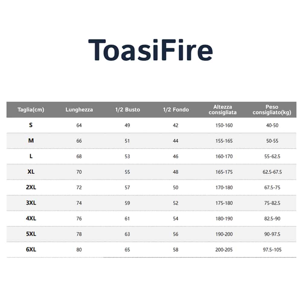 Consulta la tabella delle taglie dettagliata sul sito. Il ToasiFire Gilet Riscaldato offre taglie dalla S alla 6XL. Si consiglia di misurare il torace e confrontare con le specifiche per una vestibilità perfetta.