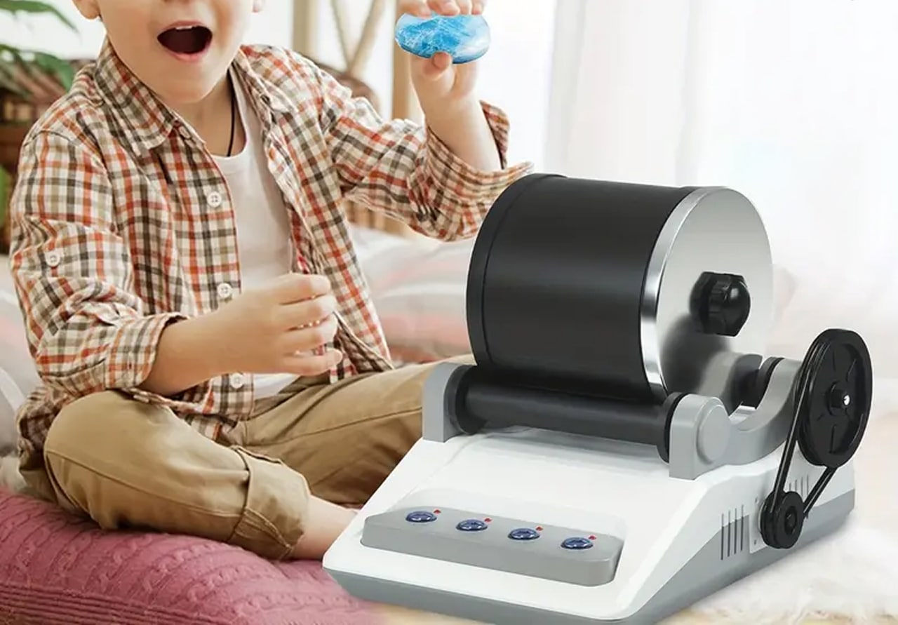 While the Tumblokzy is designed for easy kid-use, we recommend adult supervision for the initial setup and when handling the polishing grit. Once running, the automatic timer allows for largely independent operation.