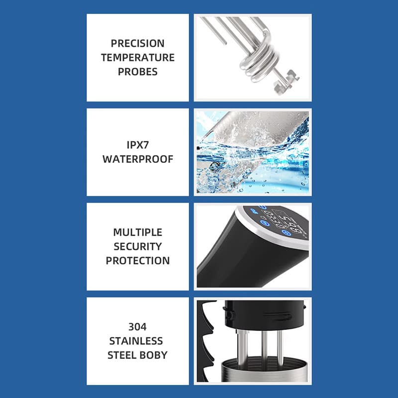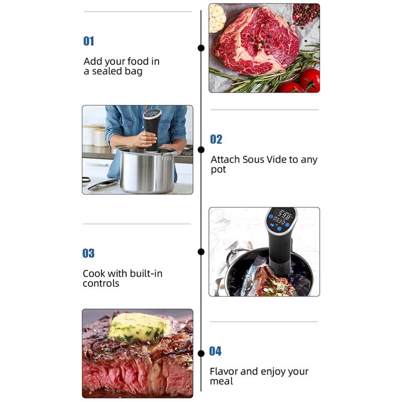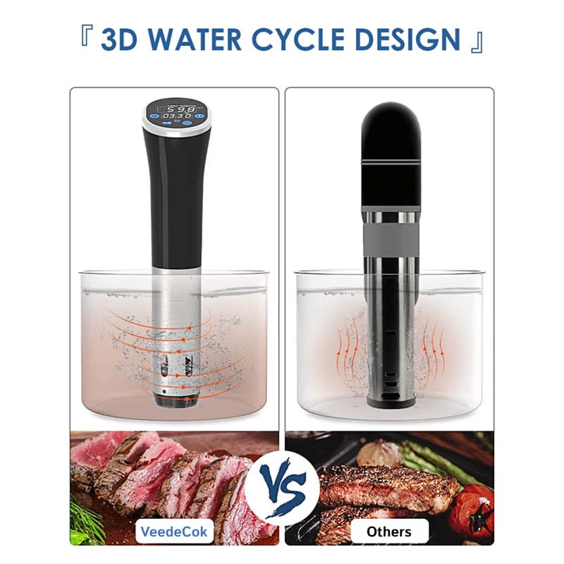 The VeedeCok features a powerful 3D water circulation system that moves water at 7-8L/min, ensuring consistent temperature distribution throughout your cooking vessel. This constant circulation eliminates hot spots and guarantees that every part of your food cooks evenly and precisely to your desired doneness.