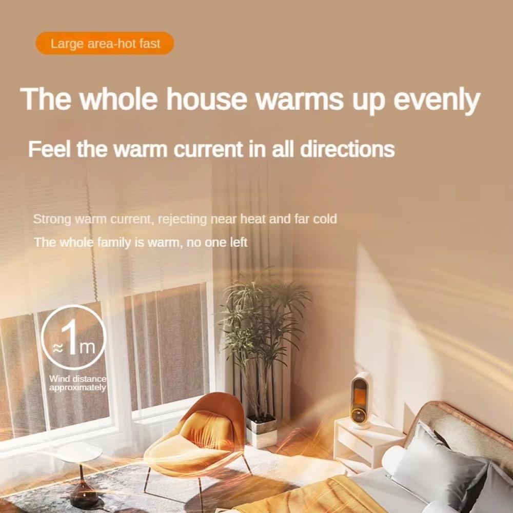 The 1200W PTC ceramic heating element provides almost instant warmth within 3 seconds, ensuring quick comfort in any room.